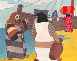 Giona dà dei soldi ai marinai per partire con loro sulla nave verso un'altra direzione, verso un paese molto lontano.